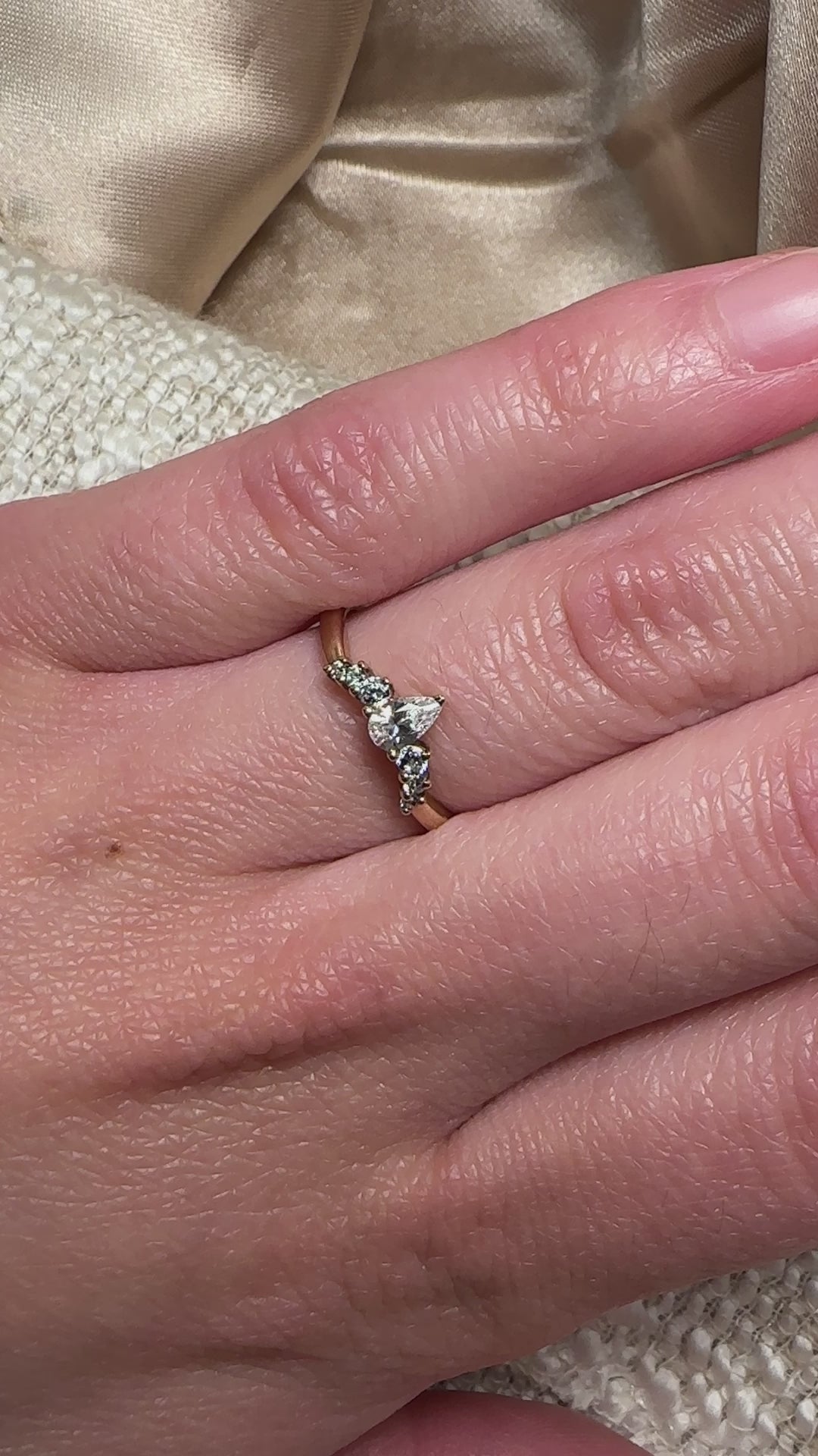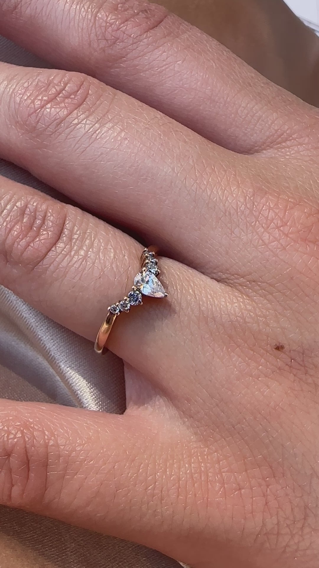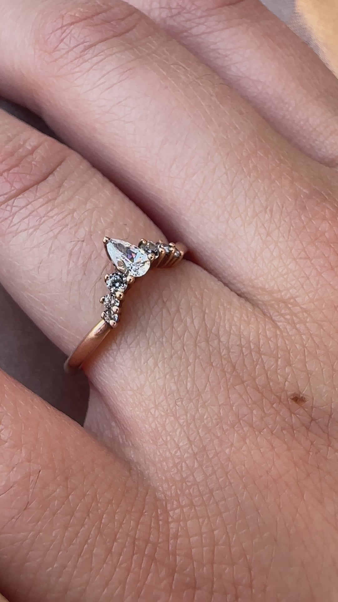 The chevron arrangement of the ring features a stunning pear-cut diamond centrepiece nestled among brilliant round cut accent stones. This thoughtful design symbolizes direction and purpose: pointing inward for moments of self-reflection or outward toward new beginnings and possibilities.