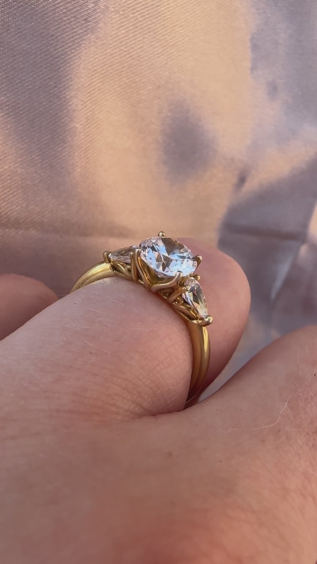 Our signature three-stone design features a stunning 1 carat (6.5mm) centre stone complemented by two 0.15 carat pear-cut side stones. This trilogy arrangement symbolizes life's chapters: where you've been, where you are, and where you're headed together. As they say, good things come in threes, making this design a meaningful celebration of your love story.